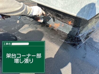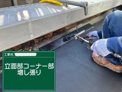 立上り付近のような角には強度を高めるためシートを増し張りを行います。