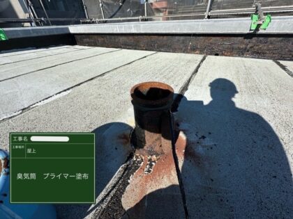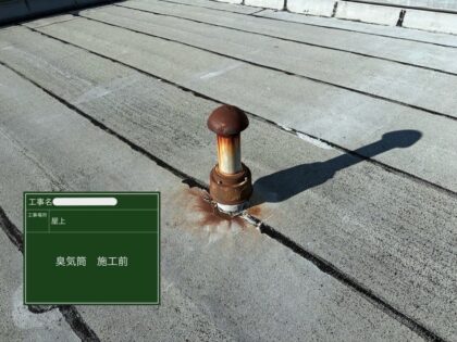 臭気筒があります。立上り部分に防水層が被せてあるので、ここも施工が必要になります。