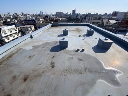 屋上防水工事 防水層穿孔 平場(4穴/㎡) ウレタン防水通気工法 脱気筒工事 改修用ドレン工事 ウレタン塗膜防水 パラペット笠木+立上りウレタン防水 板橋区双葉町マンションS