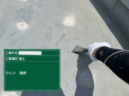 古くなった防水層をスクレーパーという専用工具でケレンしながら撤去します。