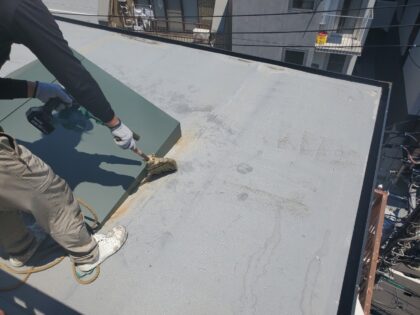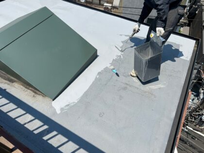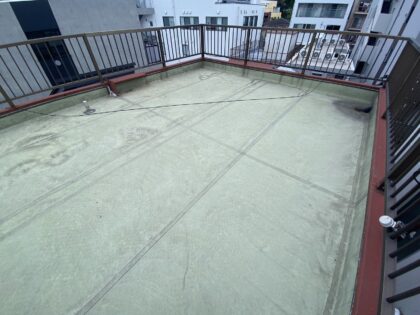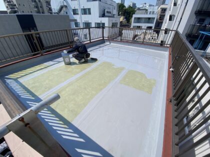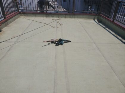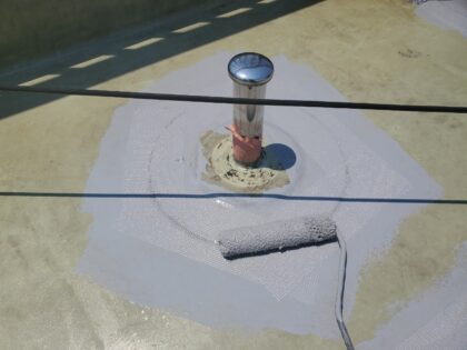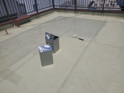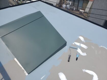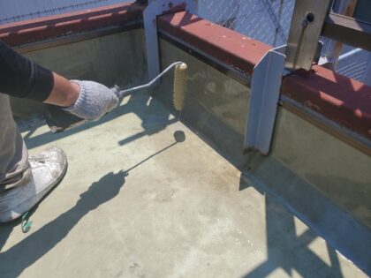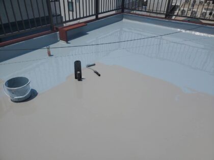トップコートで防水層を保護して防水完了となります。トップコートは、ウレタン防水主材塗膜を保護する役割があり防水層を太陽の熱や紫外線から守り直接に外気や雨などの影響による劣化を防ぐ効果があります。
