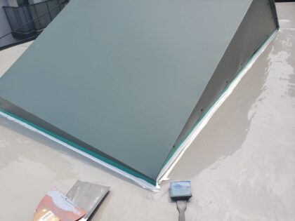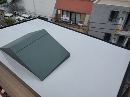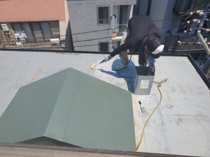 天窓塞ぎ 屋上防水工事 シート防水ジョイント防水補強クロステープ貼り 鉄製笠木周囲防水 改修用ドレンと脱気筒周り補強クロス貼り防水 ウレタン塗膜防水 文京区水道I様