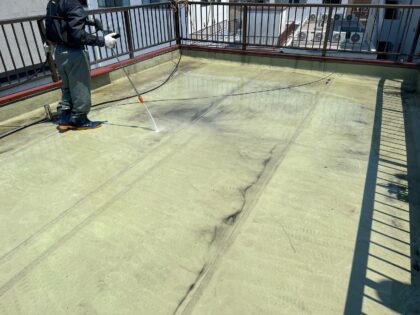 防水面をバイオ高圧洗浄で現状の汚れを洗い落とし、清潔な状態にしてから防水を行うことで密着性を高めるために不可欠な作業です。