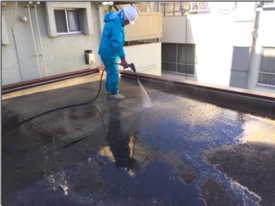 高圧バイオ洗浄で屋上を洗い流します