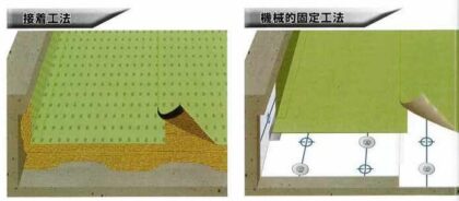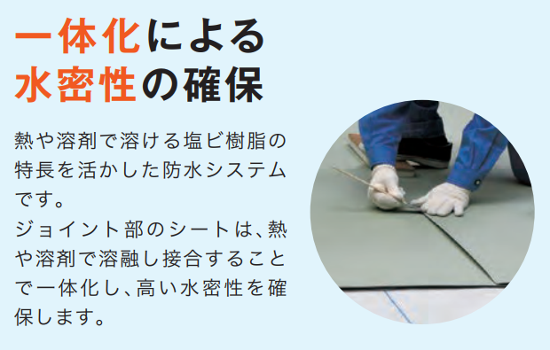 塩ビシート防水工法には接着工法と機械固定工法があり、塩ビ樹脂と基材を複合した塩化ビニル樹脂系シート防水材です。
