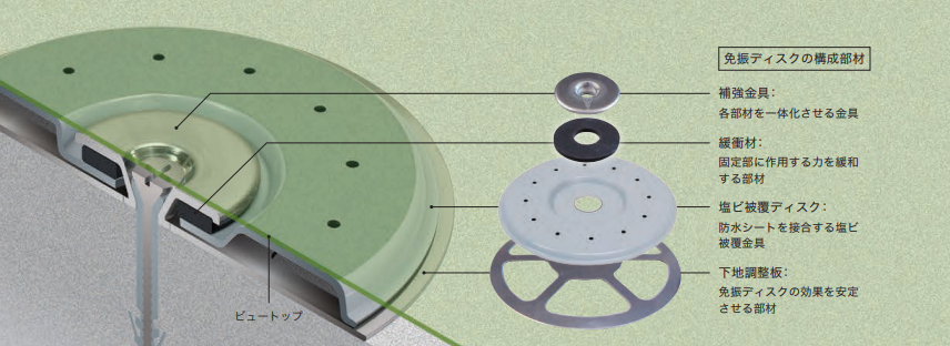 塩ビシートを塩ビ鋼板製のプレートとディスクに溶着し、アンカーを用いて躯体に固定する工法です。