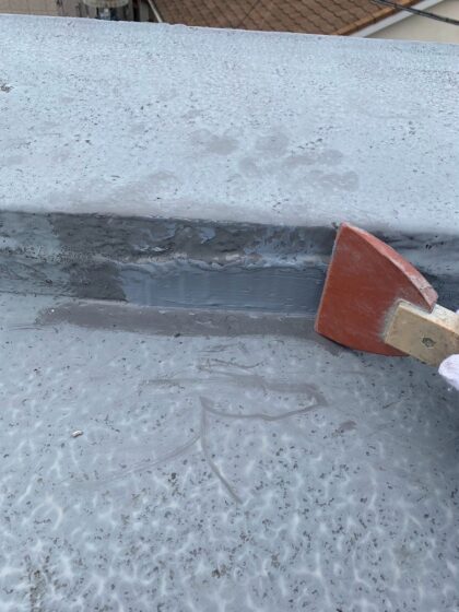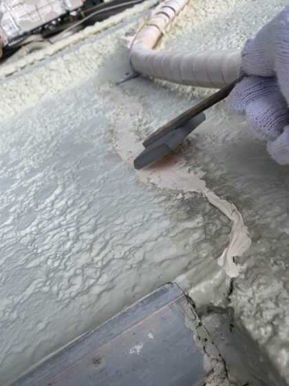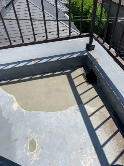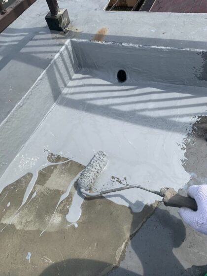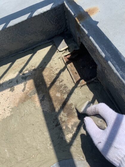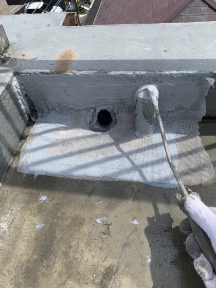 防水層を撤去した部分の下地コンクリートをカチオンモルタルで整えます。