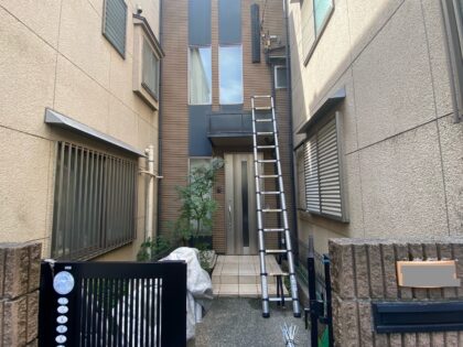 今回は玄関上のひさしのみ施工なので足場は組まず、はしごを設置します。