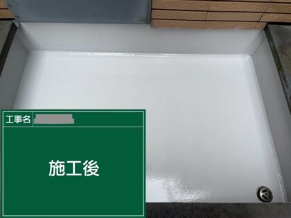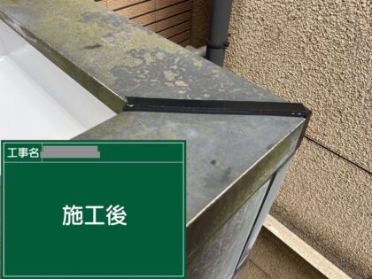 ひさしの防水施工が完了しました。お引渡しの前に当社の厳しい施工基準にて完了検査を行い、お客様にも確認をしていただきます。細部までしっかり確認後、清掃をして工事の完成です。