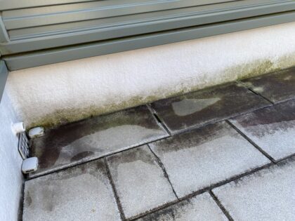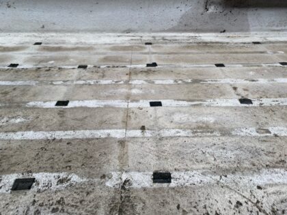 防水層にコケと水溜まりが見られます。ドレン方面に直線状に発生しているため、ドレンの水はけが悪くなり水が溜まって湿度が上がったこと原因と考えられます。
