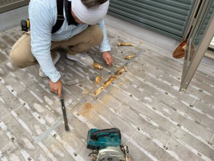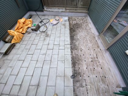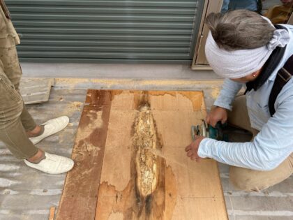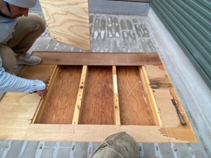 初めに撤去した床材を再度設置しました。ひび割れや劣化していた箇所は新しい床材に変え、施工完了です。