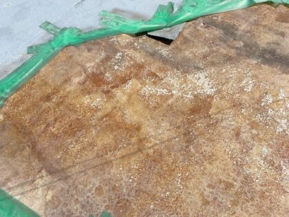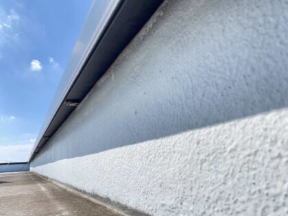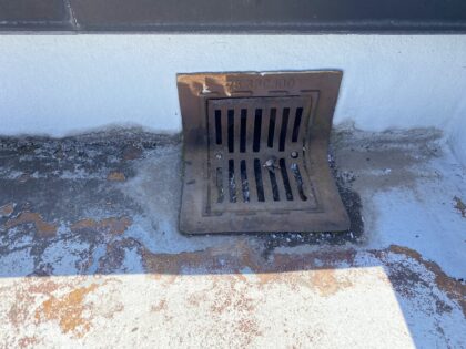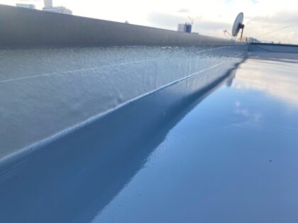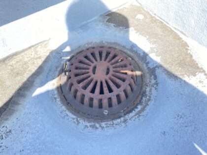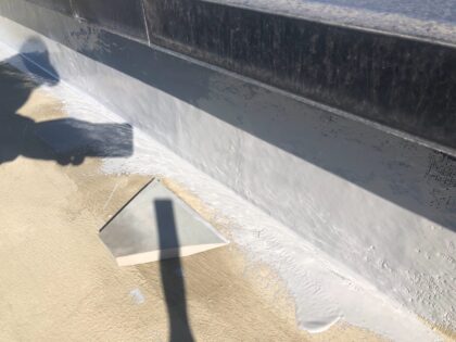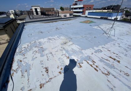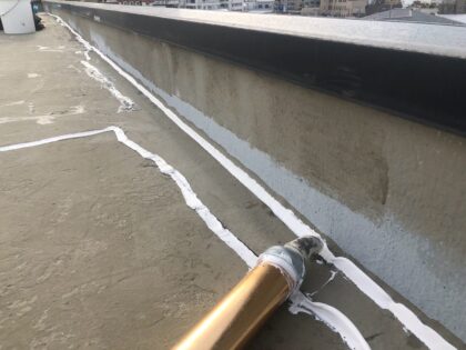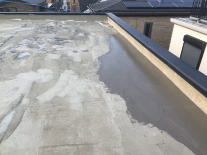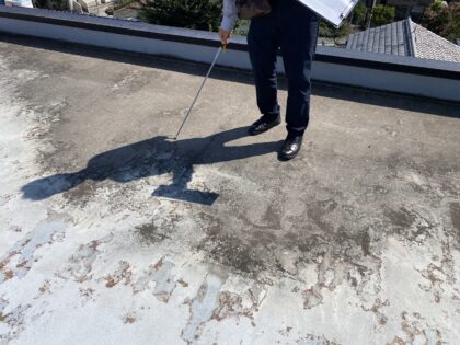 防水表層に水溜まりの跡が見られます。今回のタイミングで水溜まり跡の勾配を水はけが上手くできるようモルタルで勾配調整する必要があります。