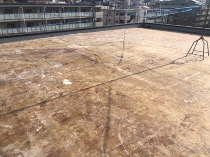 新築時防水に改修工事で防水施工されています。劣化が激しく、既存防水層を全撤去して施工になります。