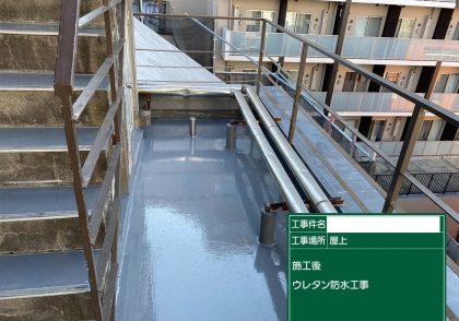 屋上斜壁防水 防水層脆弱部撤去補修し ウレタン防水密着工法 クロス入りフッ素Tトップコート 新宿区下落合F様