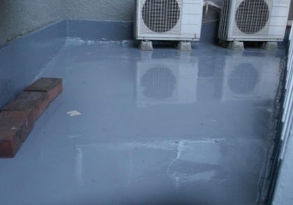 シート防水層を全撤去しカチオンモルタル補修して、屋上ベランダのウレタン防水工事